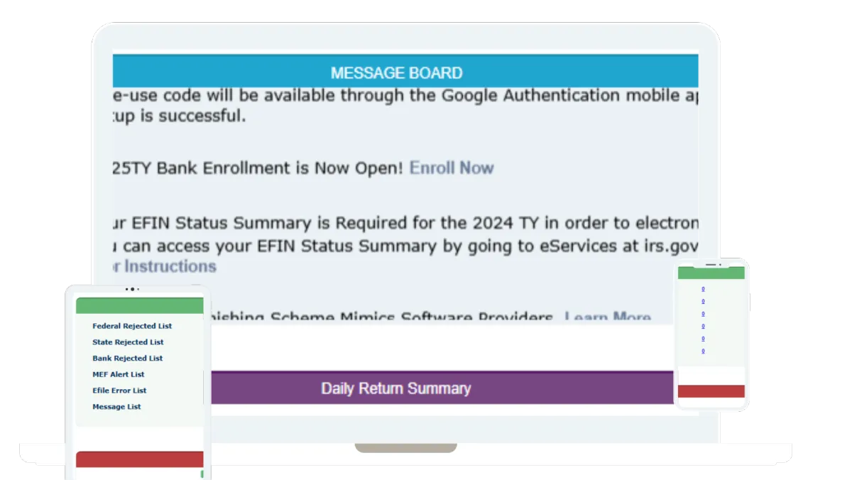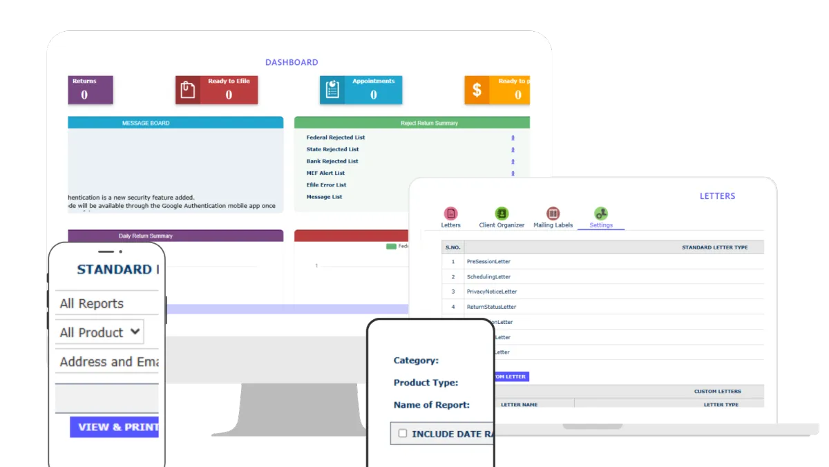 We offer professional-grade tax software to run your business. At higher tiers (Silver, Gold, Platinum), you keep 100% of your tax preparation fees. Platinum Service Bureaus also receive a co-branded software logo.
